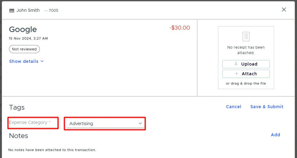 The mapping and auto sync allows you and your cardholders to select a tag value for each purchase and reimbursement. For that go to the “Transactions” menu -> locate a transaction -> click on it -> select a tag value (“Advertising” in our example below) of the “Expense Category” tag -> click “Save”. Note that you and your cardholders can select one of the tag values for each purchase once you finish the QuickBooks connector setup and sync tag options from QuickBooks to PEX.