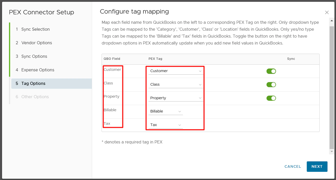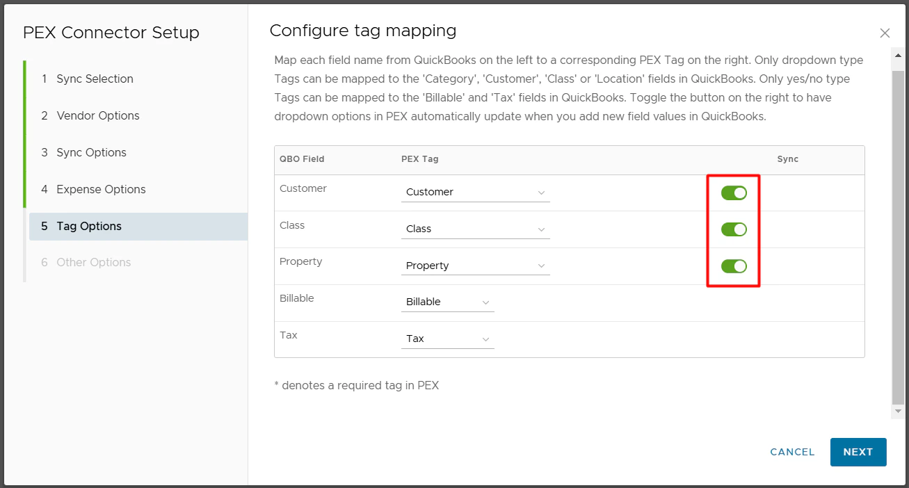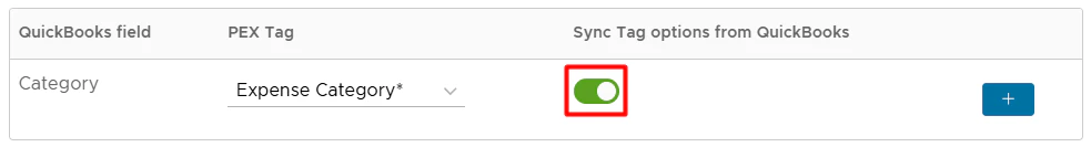 - Make sure to enable the “Sync Tag Options from QuickBooks” toggle. This will pull your expense categories from QuickBooks into PEX as tag option values.