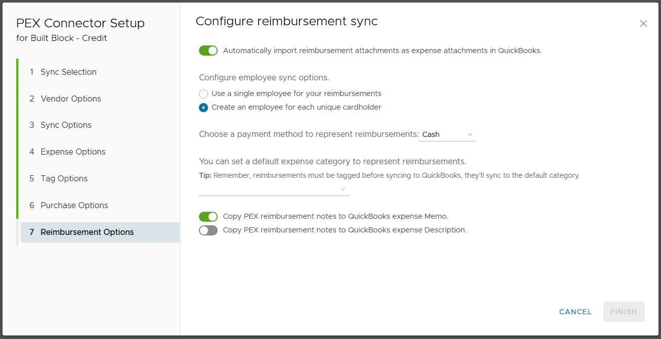 - Enable this option to import reimbursement attachments as expense attachments in QuickBooks.