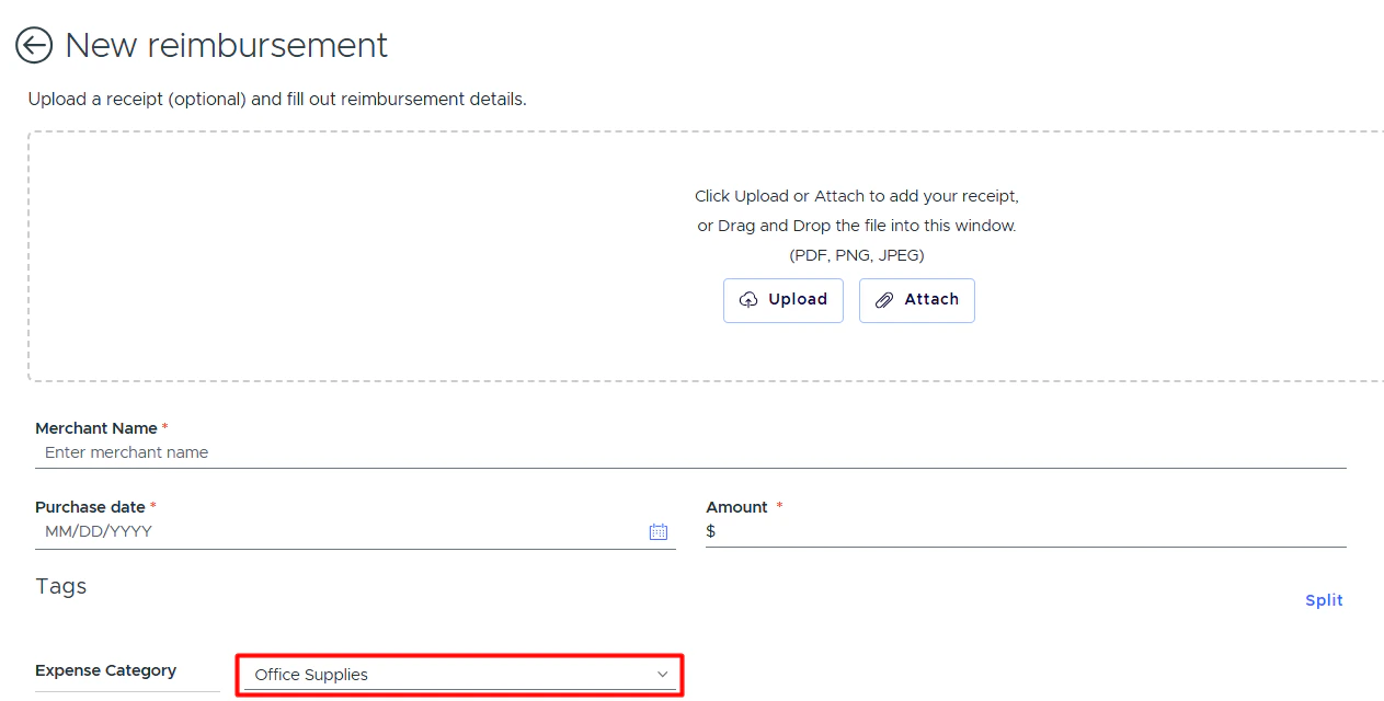 For that cardholders go to the “Requests” menu -> select “Reimbursements” -> click “New reimbursement” -> select an expense account value (“Office Supplies” in our example below) of a tag (“Expense Category” in our example below).Note that you and your cardholders can select one of the tag values for each reimbursement once you finish the QuickBooks connector setup and sync tag options from QuickBooks to PEX.