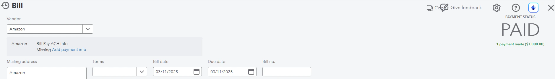 - Checked: The Memo field will include “Paid by [user name]” and the bill payment notes.