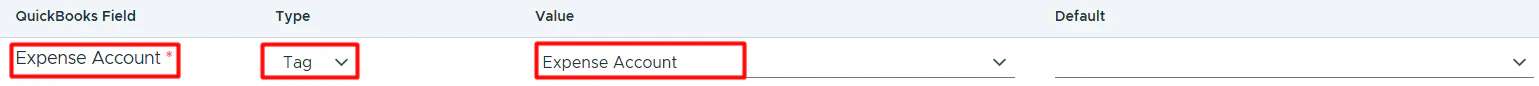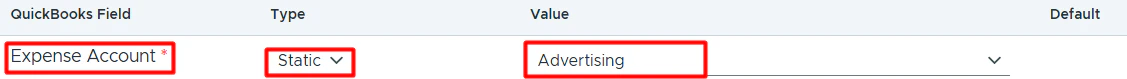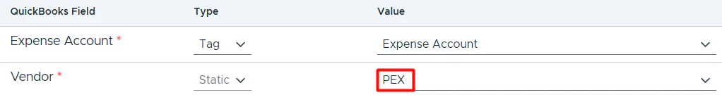 Fields can be mapped to either static values or PEX tags. If using PEX tags, create them in advance following the Create PEX tags for QuickBooks Online article. Example: Mapping the “Expense Account” field Option 1: Static value- Select a single QuickBooks account (e.g., “Advertising”) that will apply to all PEX bills during sync.