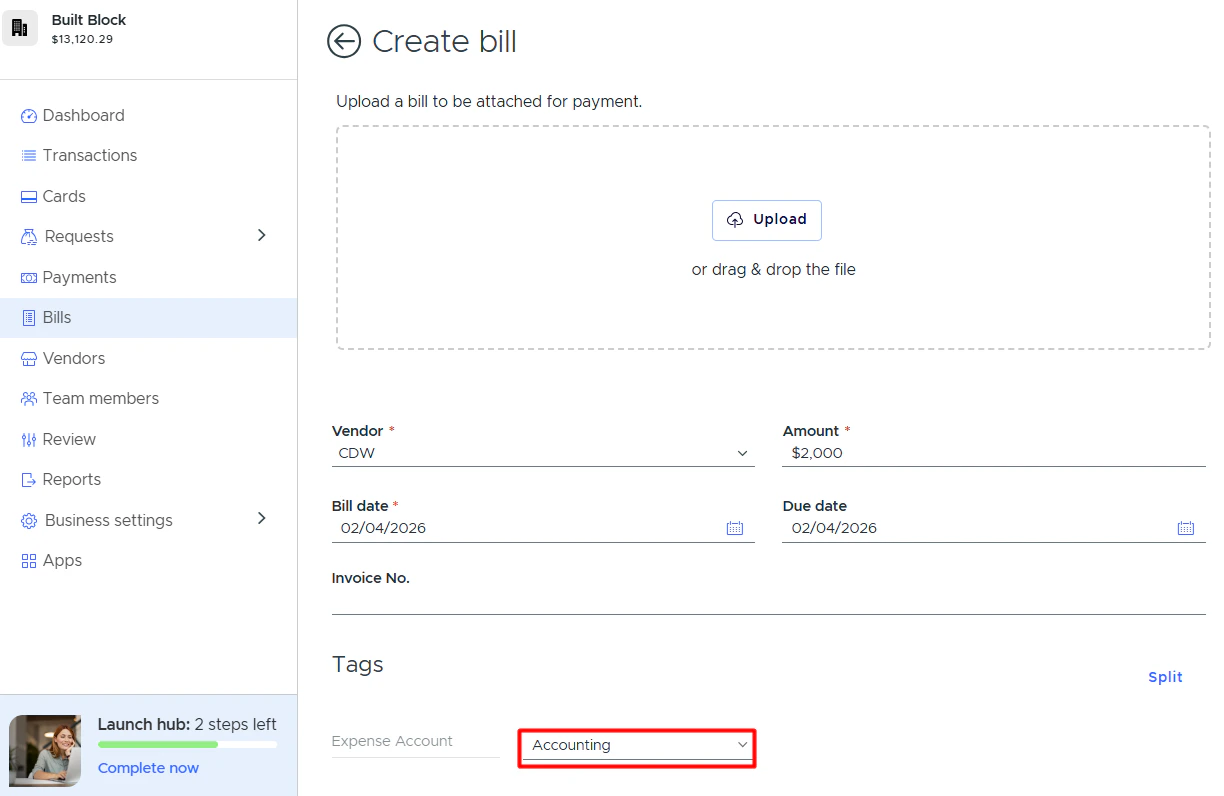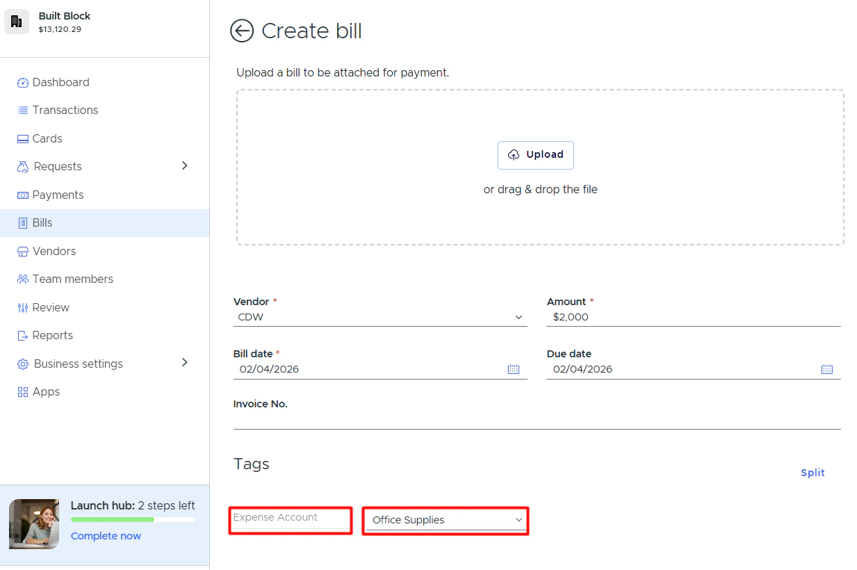 - Map to a PEX tag (e.g., “Expense Account”) so you can select a value for each bill.