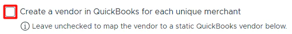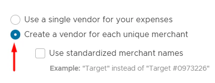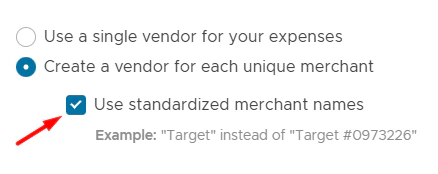 With the “Create a vendor for each unique merchant” option, you can also sync your purchases with standardized merchant names if you check “Use standardized merchant names” checkbox.