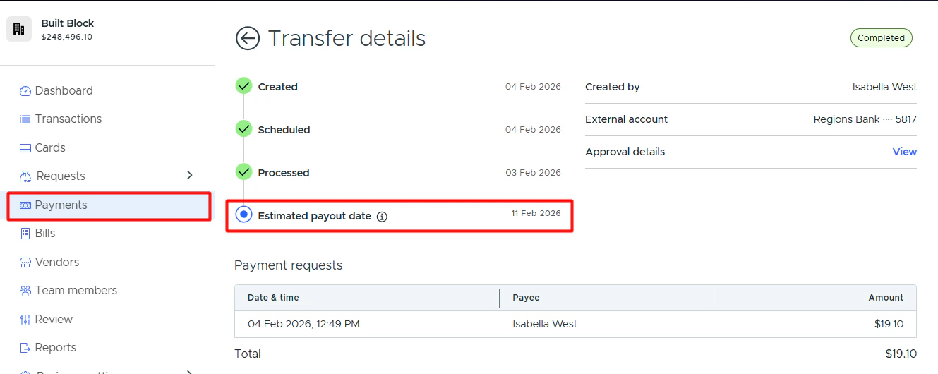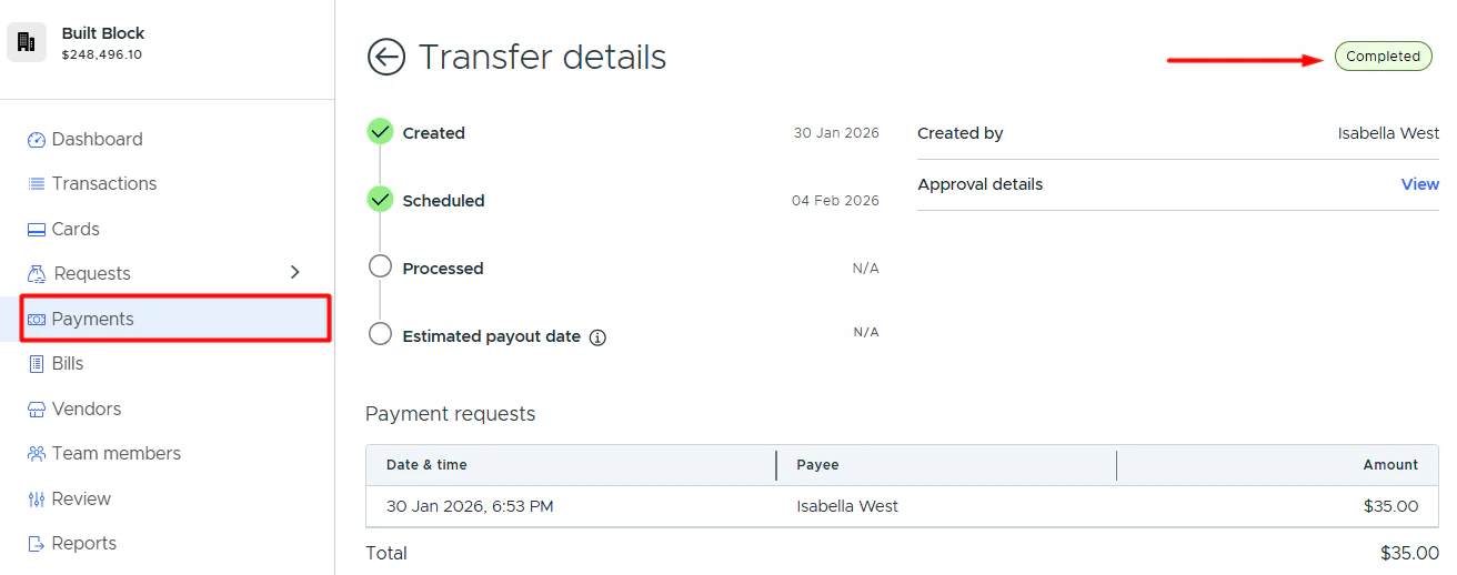 Bill payments made with vendor cards will sync when the transfer shows “Completed” status.