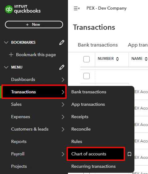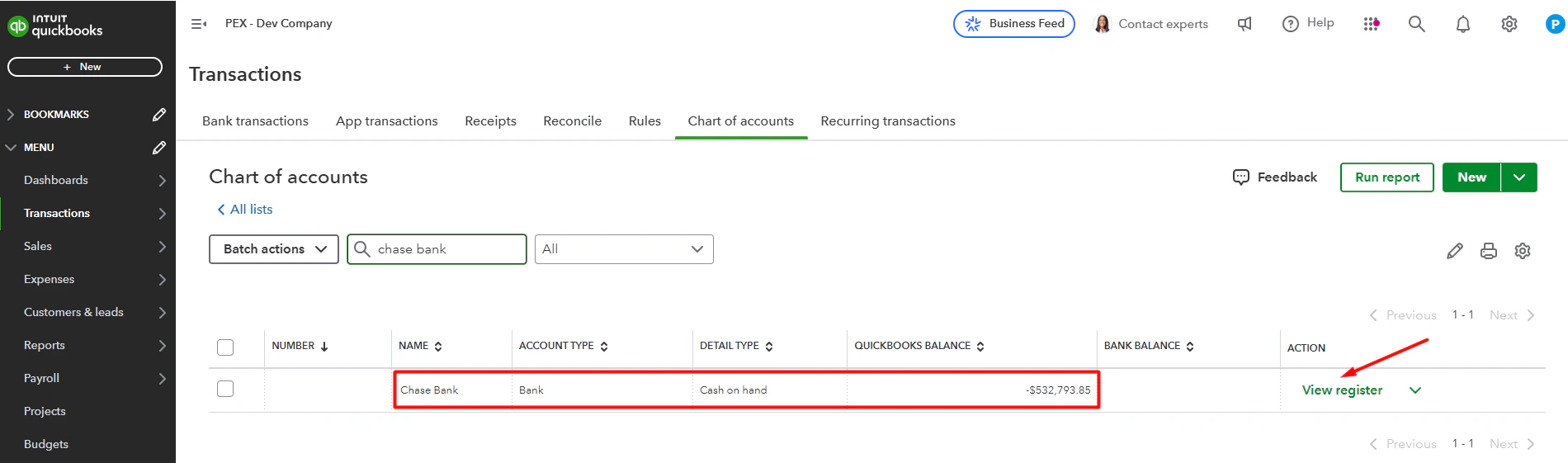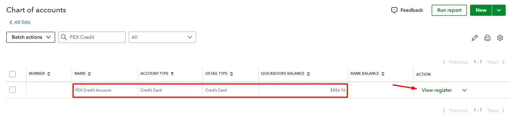 Log into QuickBooks account and navigate to Transactions -> Chart of accounts -> Click “View Register” next to the account representing your PEX account (“PEX Credit Account” in the example below) to view synced transactions.