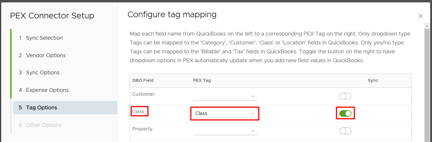 - Make sure to enable the “Sync” toggle. This will pull your Classes, Customers, and Locations from QuickBooks into PEX as tag option values.