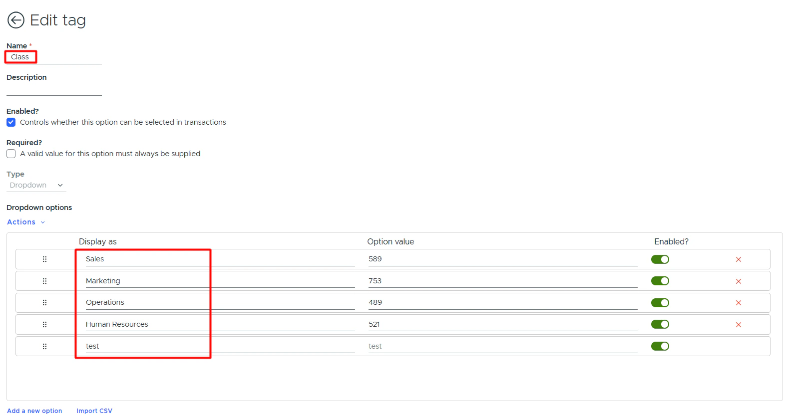 - Class, Customer, and Location should be mapped to PEX tags with the type set to “Dropdown”.
