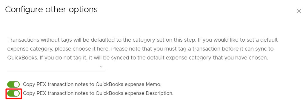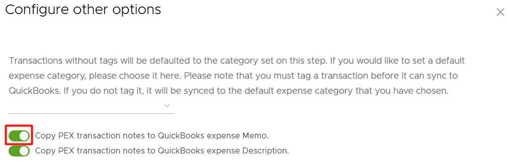 - This option is available only if the “Automatically import PEX purchases as QuickBooks expenses” toggle is enabled.