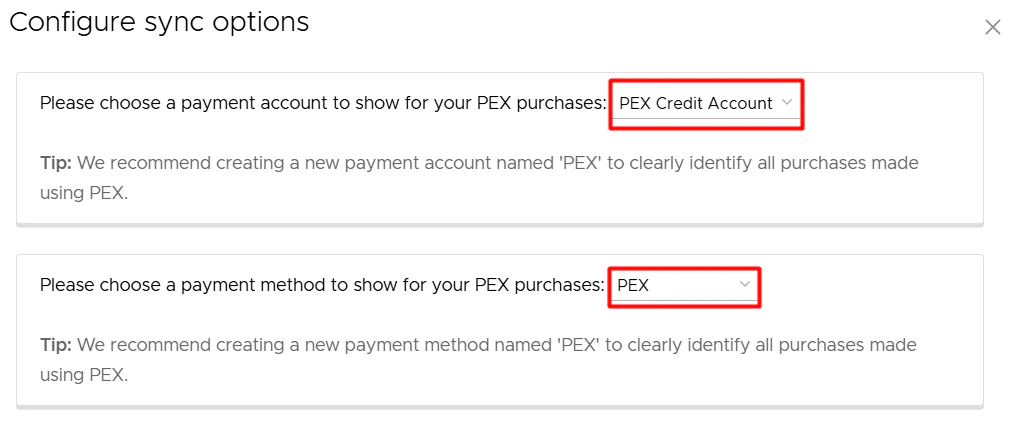 - We recommend creating a new payment method named “PEX” to clearly identify all purchases made using PEX.