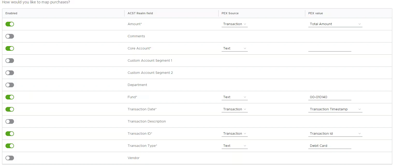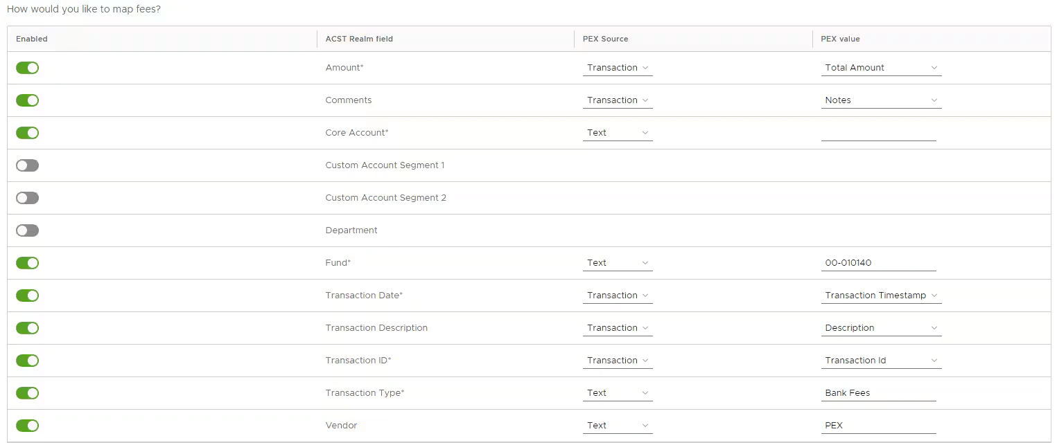 If you would like to map FEES, follow the step for each of the fields. All required fields denoted with * will be enabled by default. The Target field maps to Realm. The Source options include Text, Tag, and Transaction. The Source value will change based on the Source option selected. All options included as a default can be updated based on your preferences.