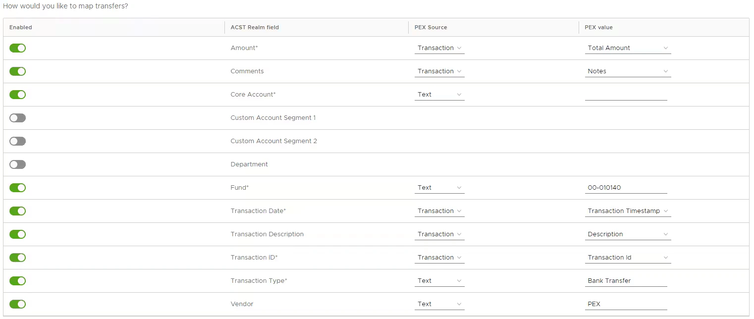 If you would like to map TRANSFERS, follow the step for each of the fields. All required fields denoted with * will be enabled by default. The Target field maps to Realm. The Source options include Text, Tag, and Transaction. The Source value will change based on the Source option selected. All options included as a default can be updated based on your preferences.