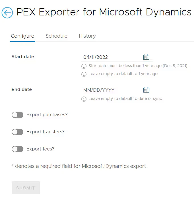 Repeat the setup in the same way for Transfers and Fees. Once all required fields are populated, click Submit.