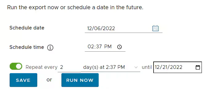 You can create a schedule by specifying the Schedule date and Schedule time when the file will be generated. The schedule can be recurring by turning on the Repeat toggle.
