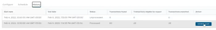 When the export file is run now or on the set schedule, the file is available to download in the History section. The History tab lists prior exports, including the date range selected, status, number of transactions found, number eligible, and number exported. The Action column includes a download button when the file is ready. For a small date range with few transactions, the download is usually ready in less than a minute. For a large date range, it may take a few minutes—refresh the screen for the latest status.
