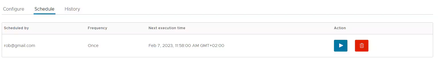 A schedule can be created specifying the Schedule date and Schedule time on which the file will be generated. The schedule can be made recurring by turning on the Repeat toggle switch. Once the Schedule is saved, you will see a list of your saved schedules. Options in the “Action” column will allow you to run ad-hoc reports or delete the schedule.