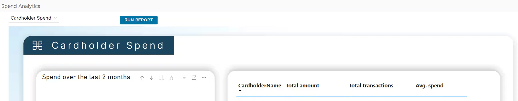 The Cardholder spend report displays an overview by cardholder. Here you can see the following information: