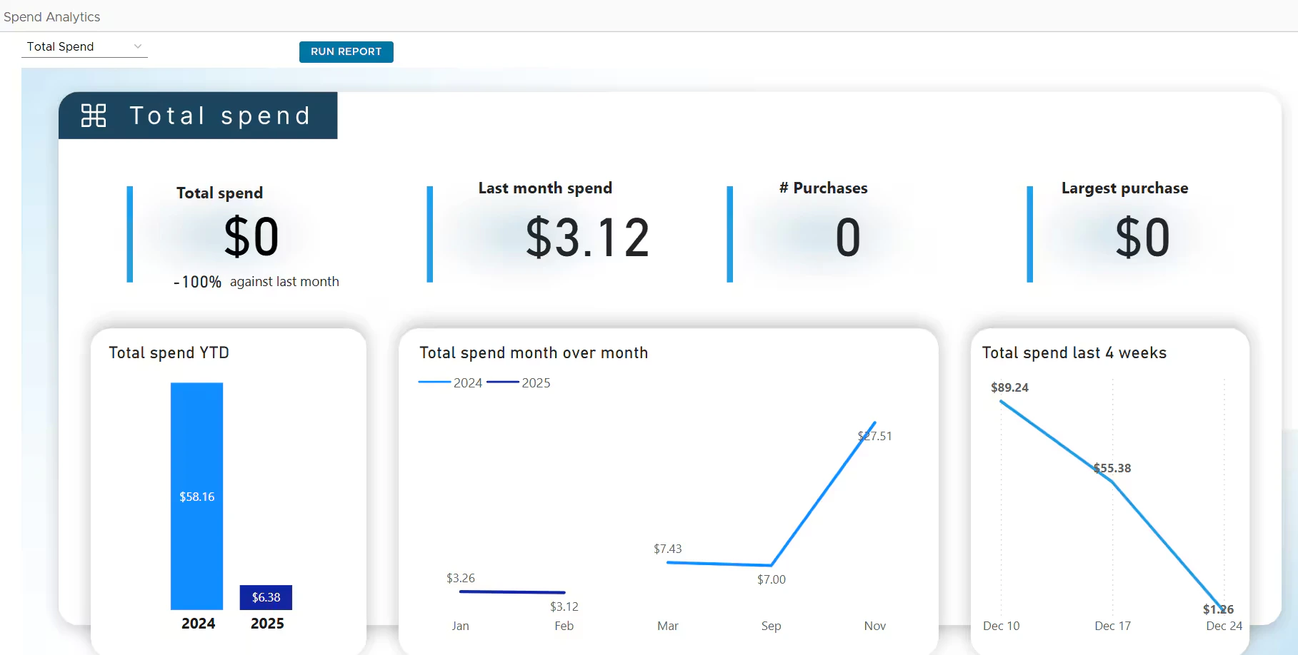 The Total spend report displays an overview of your PEX spend for the current and prior month. Here you can see the following information: