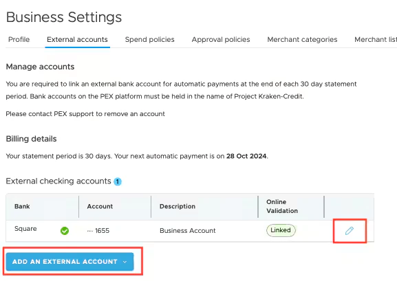 • Sometimes the Instant Account Verification via Open Banking Providers link for your external bank account can become unlinked. This usually happens if you make a change to your banking login credentials or Instant Account Verification via Open Banking Providers have made updates that require a customer to relink. For some banks, the Instant Account Verification via Open Banking Providers link can also time out. Your bank may email to notify you if your bank account becomes unlinked. You can verify if your bank account has become unlinked by navigating to your bank account on your PEX dashboard by going to Business settings-> External accounts. It will be listed under the “Online validation” column and will reflect as either linked or unlinked.