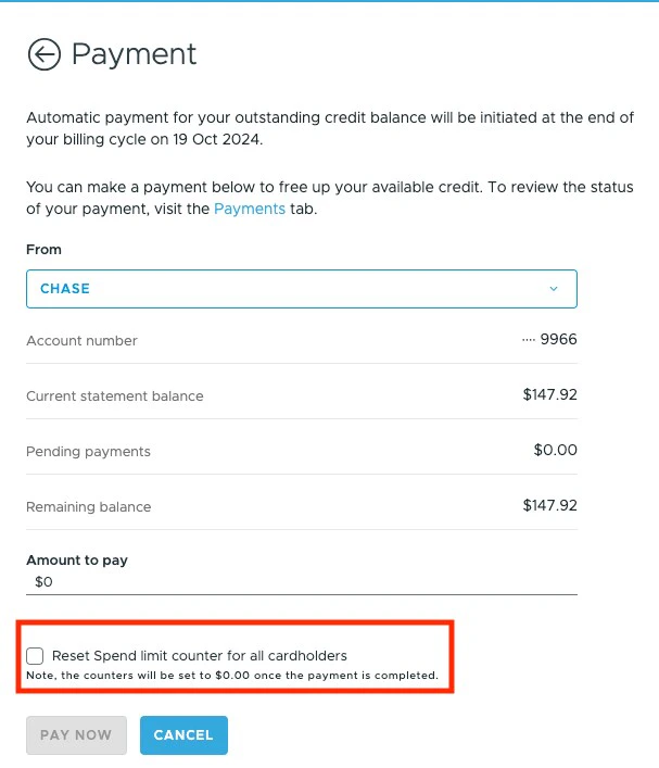 If you wish to reset the Cardholder’s spend counter after an early repayment, there are 3 options. All Cardholder’s spend counters will reset automatically at the end of the billing cycle.  Option # 1 Reset the limit counter during early repayment for all cardholder accounts.