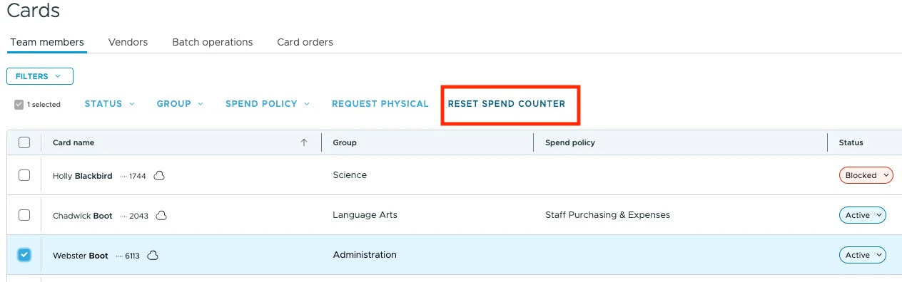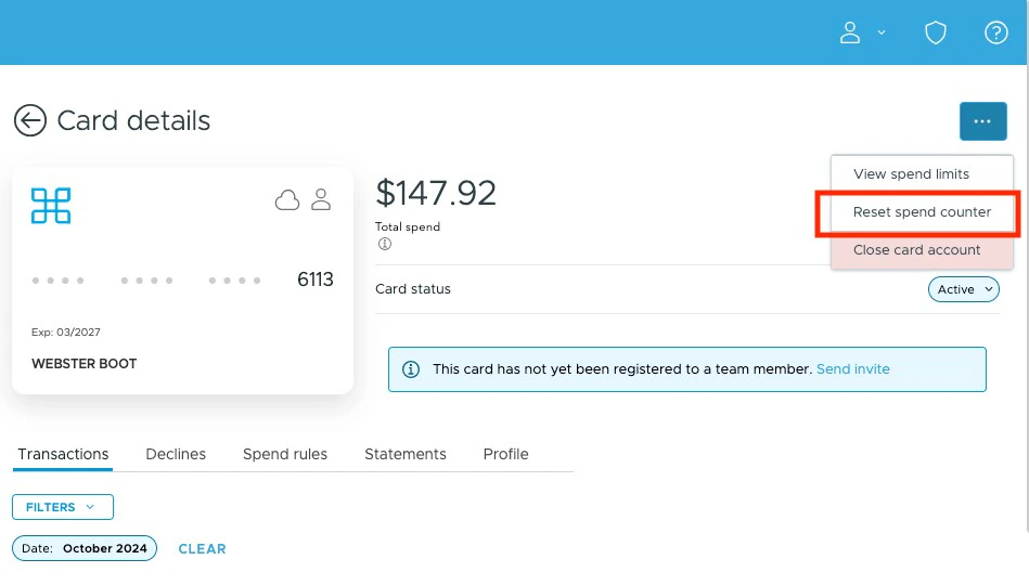 Options #3 Go into the Cardholder’s account and use the menu icon to select Reset spend counter for that individual cardholder’s account.