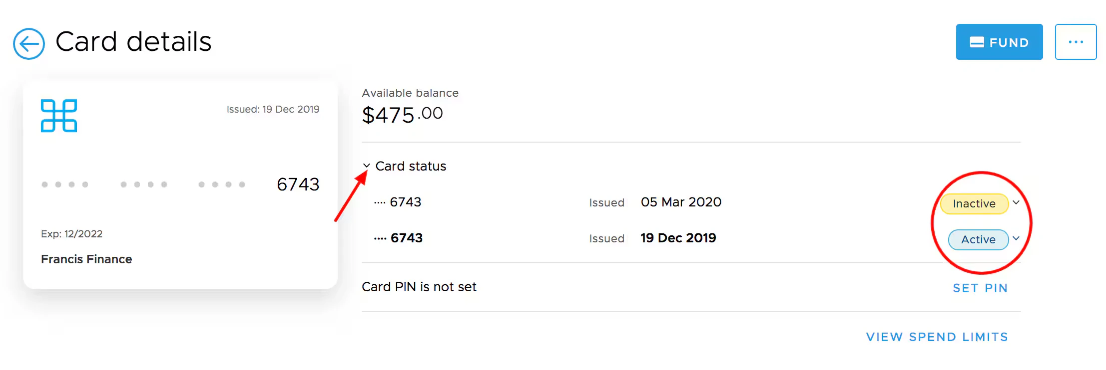 On the card details page, click the arrow next to “Card Status” to reveal the Active and Inactive cards