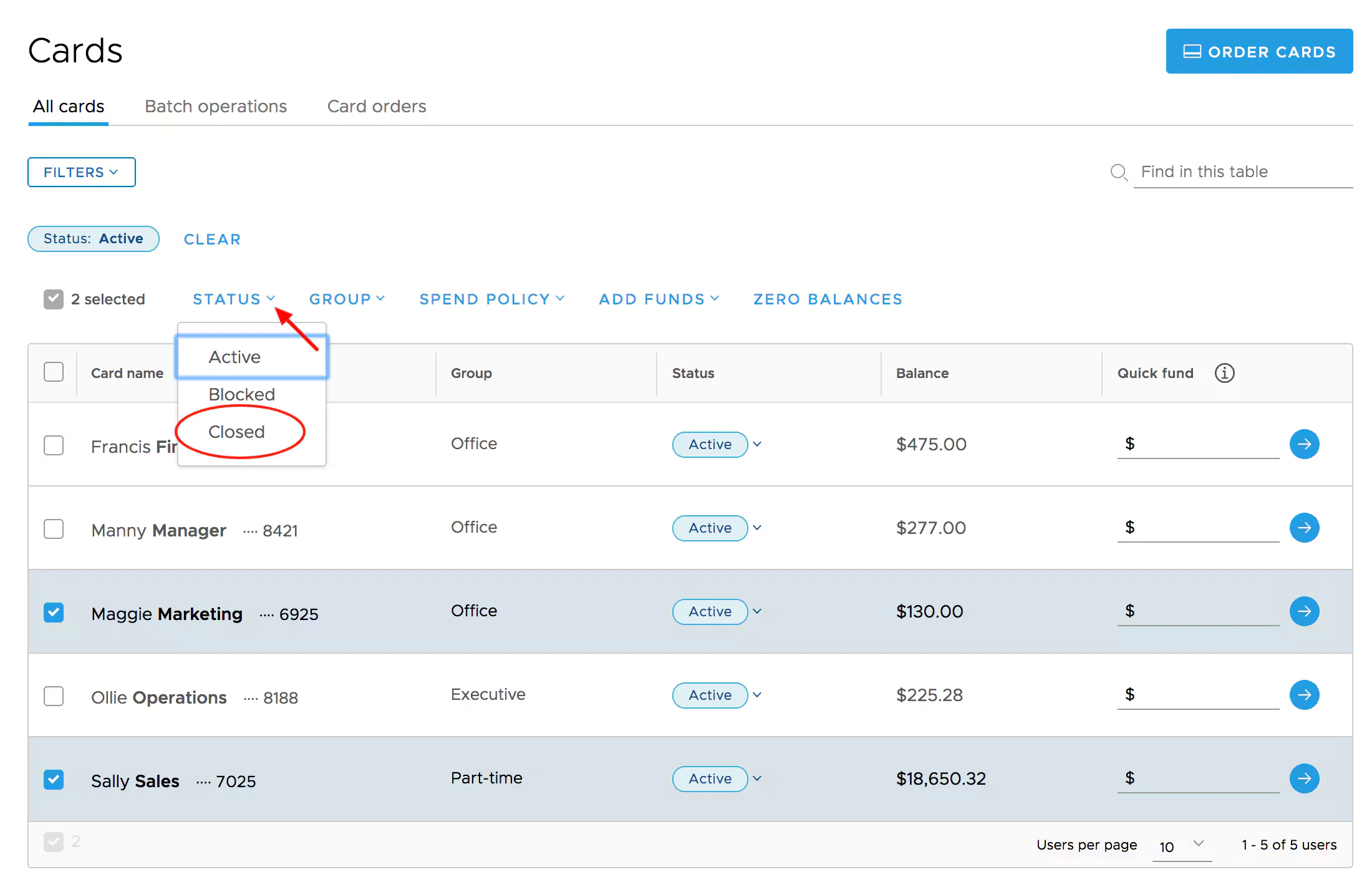 - When you close a card, any balance on the closed card is added back into the main corporate account