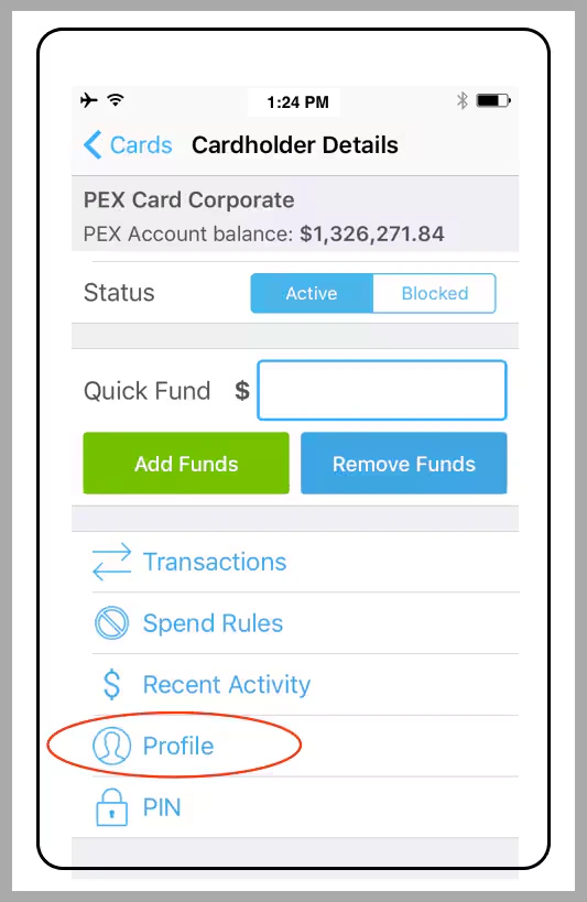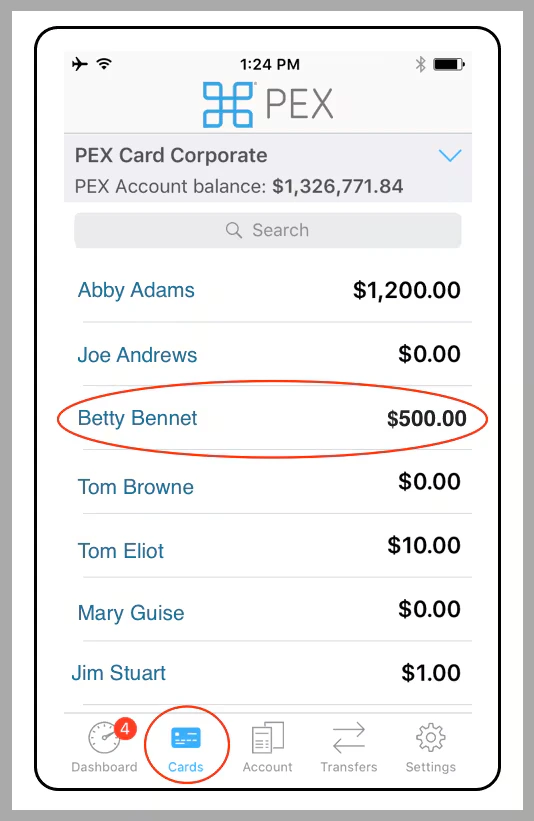 Click the “Cards” icon to see the list of cardholders. Click on the cardholder’s name.