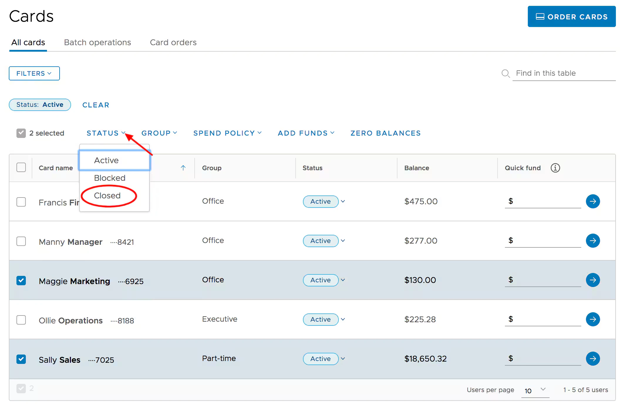 - You can use the “Filters” on the top left of the list of cards or use the “Find in this table” feature to find the cards you wish to close