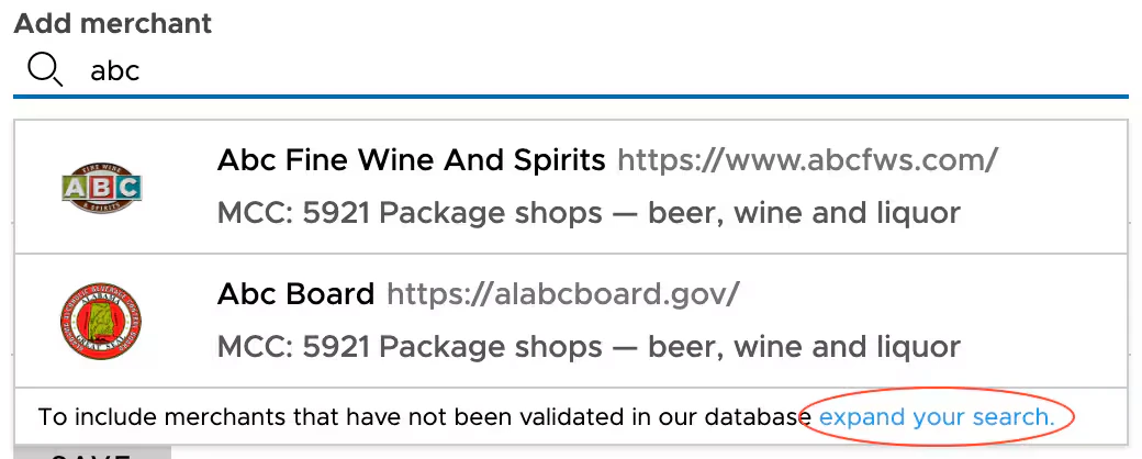 - If you are still unable to find the vendor you want, you can choose to expand your search (see below). However, the merchant results that appear from an expanded search have not been validated in our database and it is up to your discretion to use them for your card restrictions. (See Tips for Searching for Merchants)