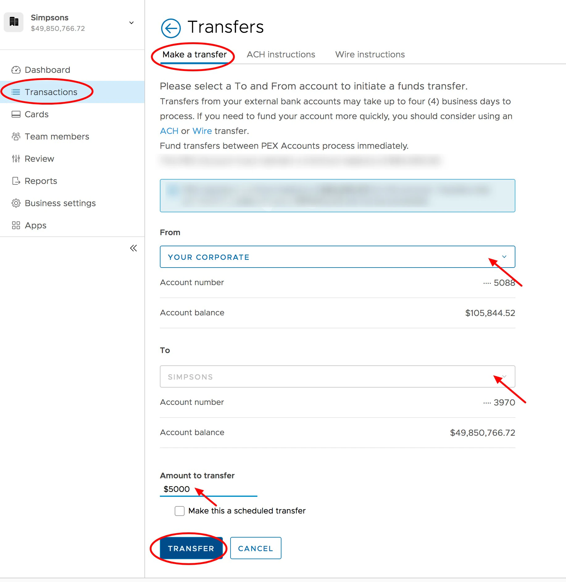 Note:Any transfers from your PEX business account by administrators to your bank will incur a $10 outbound transfer fee. These and other fees are outlined on our pricing page.