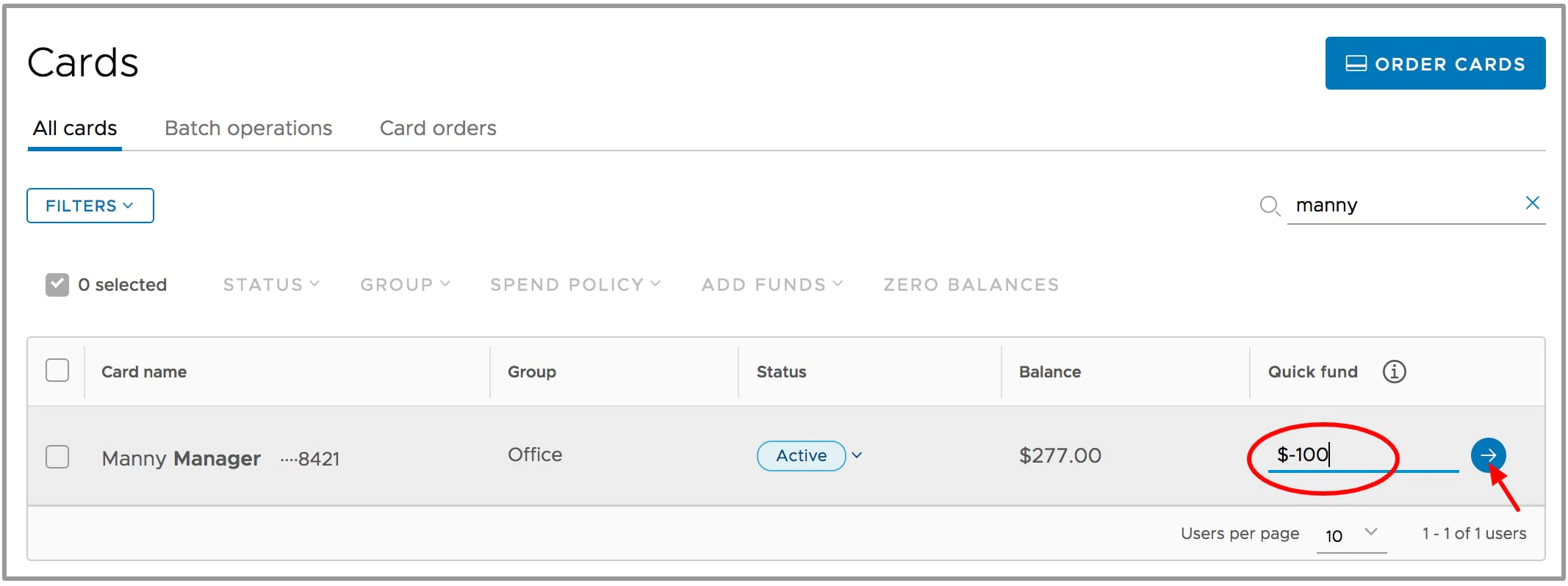 In the “Quick Fund” box, enter the amount to remove from the card (as a positive number, e.g., 200)
