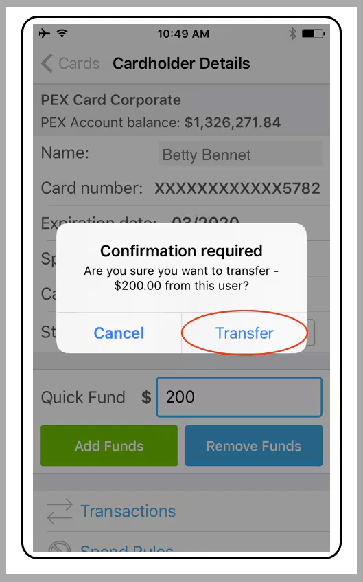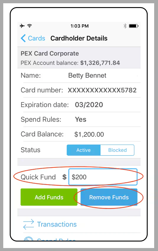 How to remove funds from a card using the Mobile App