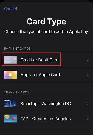 Select Card type = Credit or Debit card