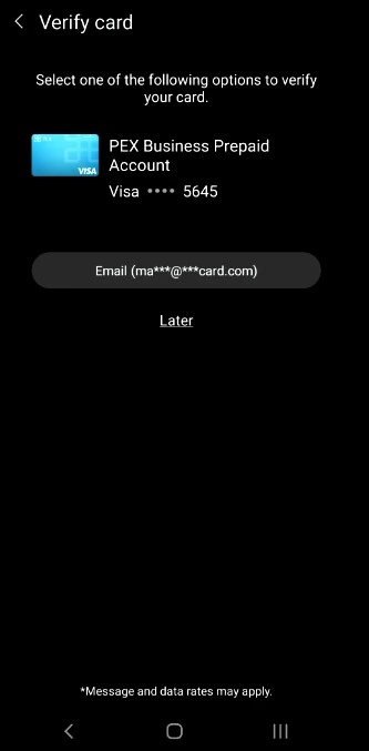 - Email - a numerical code will be sent to the email on file with PEX. This code must be entered into the digital wallet app when adding the card to the wallet.